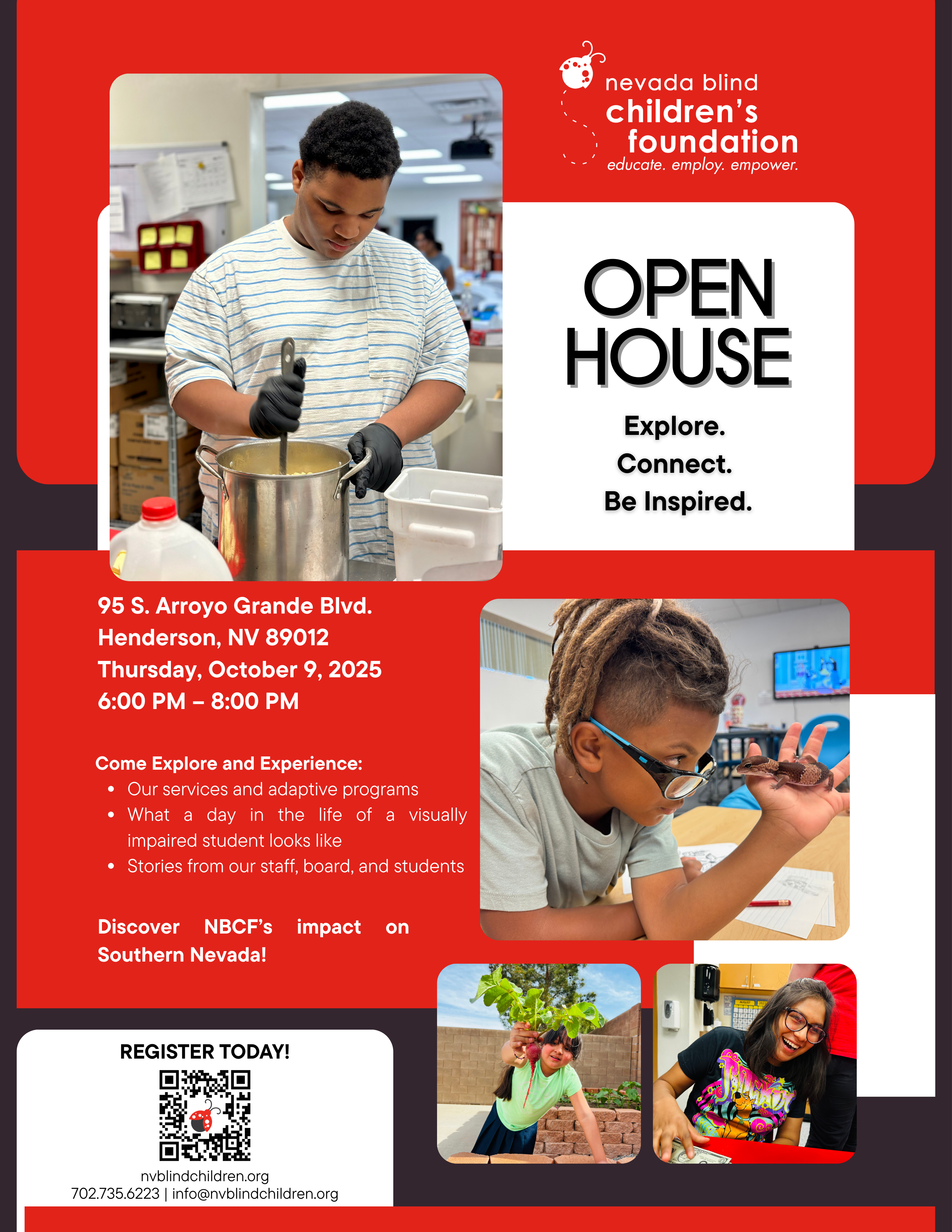 Celebrate World Sight Month with us at NBCF’s Open House on Thursday, October 9th! From 6:00 PM to 8:00 PM, explore how Nevada Blind Children’s Foundation is making a difference in the lives of children with visual impairments. Parents can connect with teachers and see their students shine, while community members are invited to learn about our programs and services. This is a great opportunity to experience first hand how a student with visual impairment navigates the world and learn how you can get involved and support our mission. Join us for an evening of discovery and celebration!