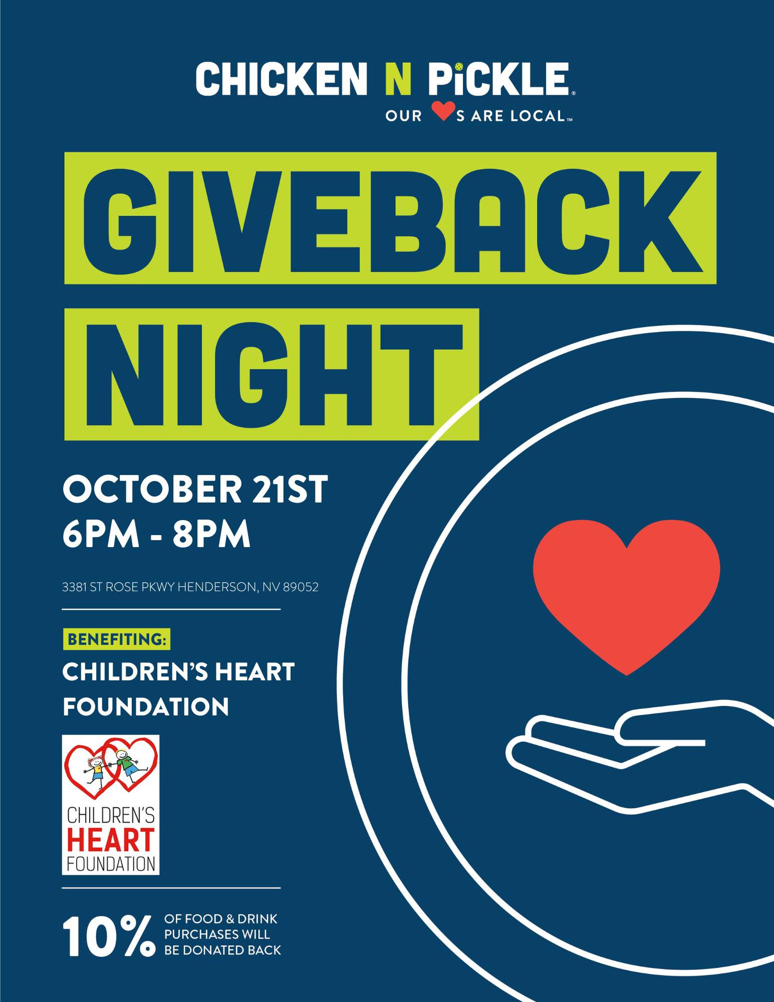 On Tuesday, October 21st, enjoy a fun evening of great food, drinks, and community at Chicken N Pickle, all while supporting Children's Heart Foundation! A portion of all food and beverage purchases will be donated to help children and families affected by congenital heart defects.