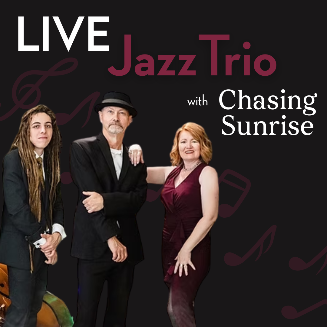 Chasing Sunrise Jazz Trio is back in the tasting room. Step back in time and immerse yourself in the golden era of jazz with their 1920s-1950s inspired band. With a lineup reminiscent of the legendary ensembles that graced the stages of speakeasies & jazz clubs, they bring in the timeless melodies.