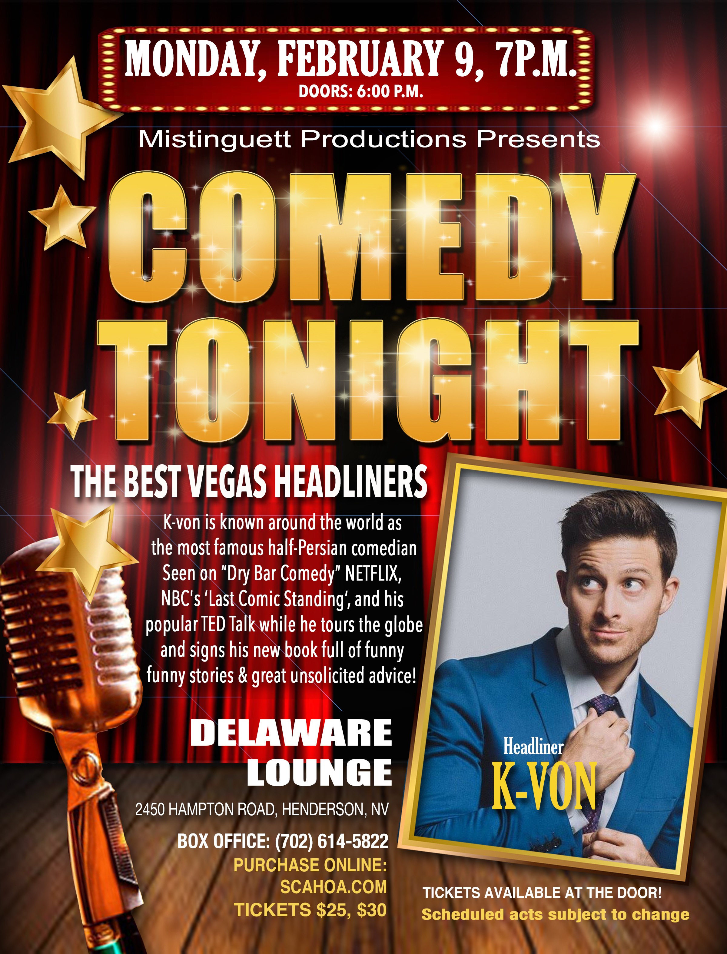 Comedy Tonight! K-Von is known around the world as the most famous half-Persian comedian. Seen on "Dry Bar Comedy" NETFLIX, NBC's Last Comic Standing, and his popular TED Talk while he tours the globe and signs him new book full of funny funny stories & great unsolicited advice.