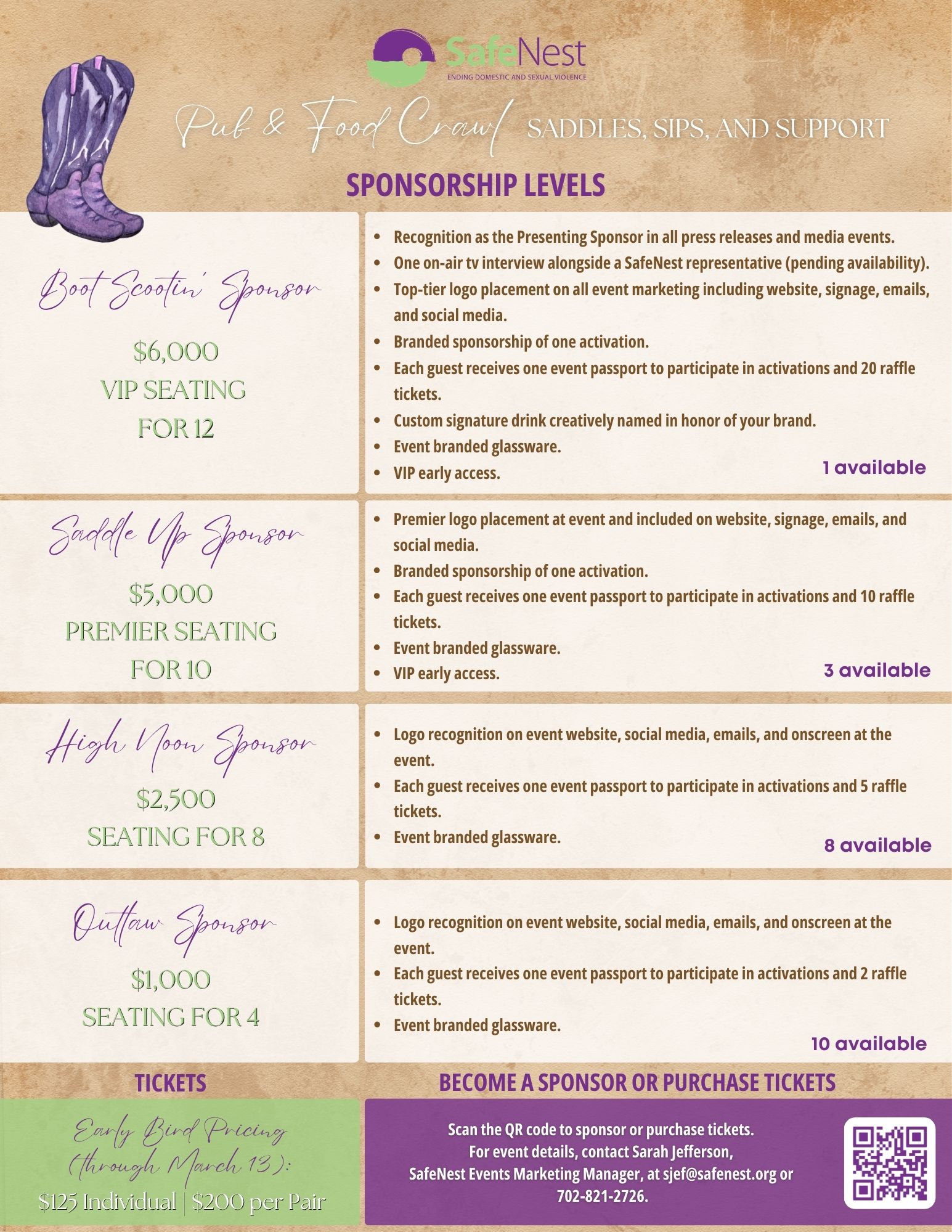 Saddles, Sips, and Support is where country charm meets a powerful cause. Dust off your boots, grab your cowboy hat, and join us at The Nest for a high-spirited pub and food crawl featuring signature sips, delicious bites, lively entertainment, and plenty of toe-tapping fun. Whether you're two-stepping between stops or just raising a glass with friends, every moment supports SafeNest’s mission to end domestic and sexual violence. Come for the fun, stay for the impact—because together, hope starts here.