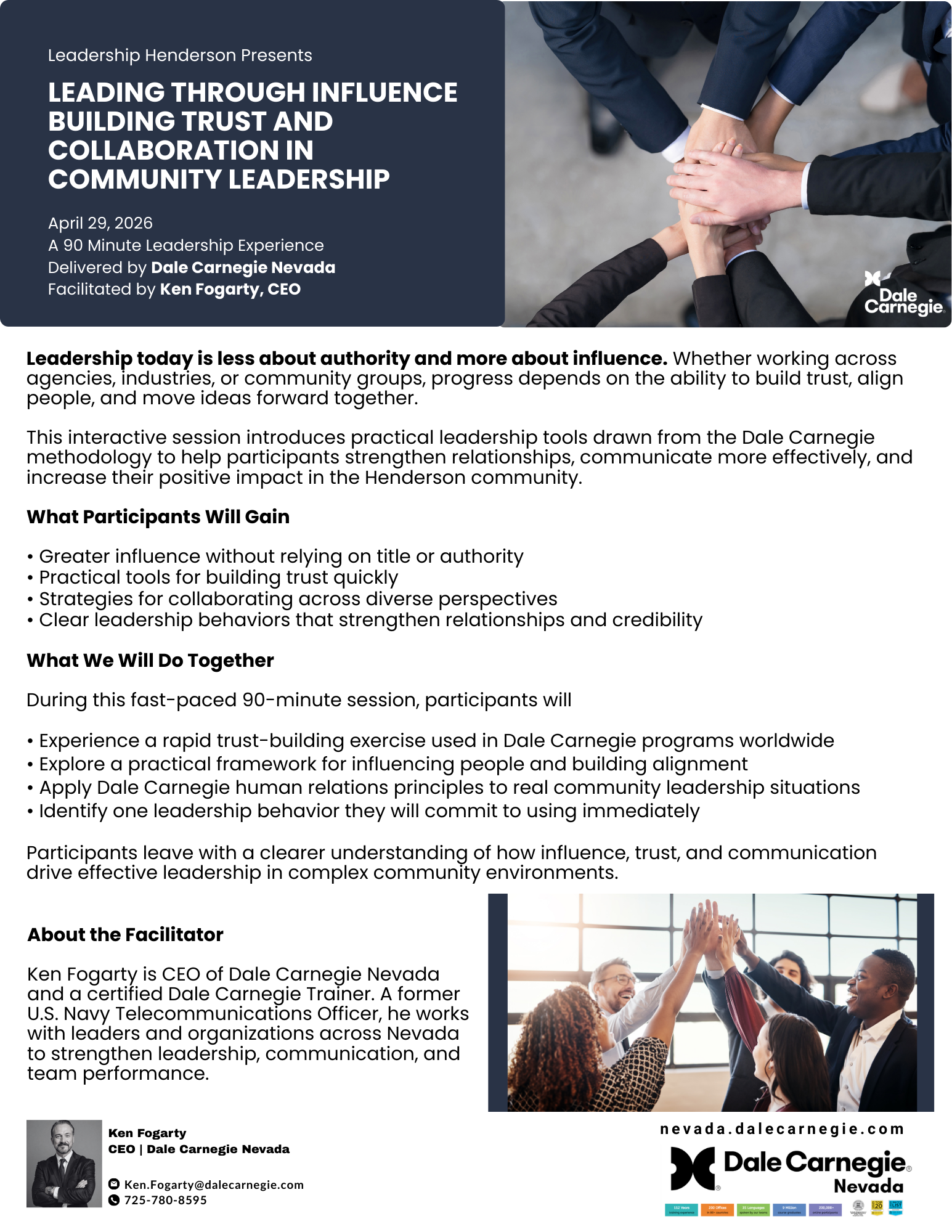 Ken Fogarty, CEO of Dale Carnegie Nevada and former U.S. Navy Telecommunications Officer, will lead this 90-minute interactive workshop focused on what matters most in community leadership today: influence without authority.