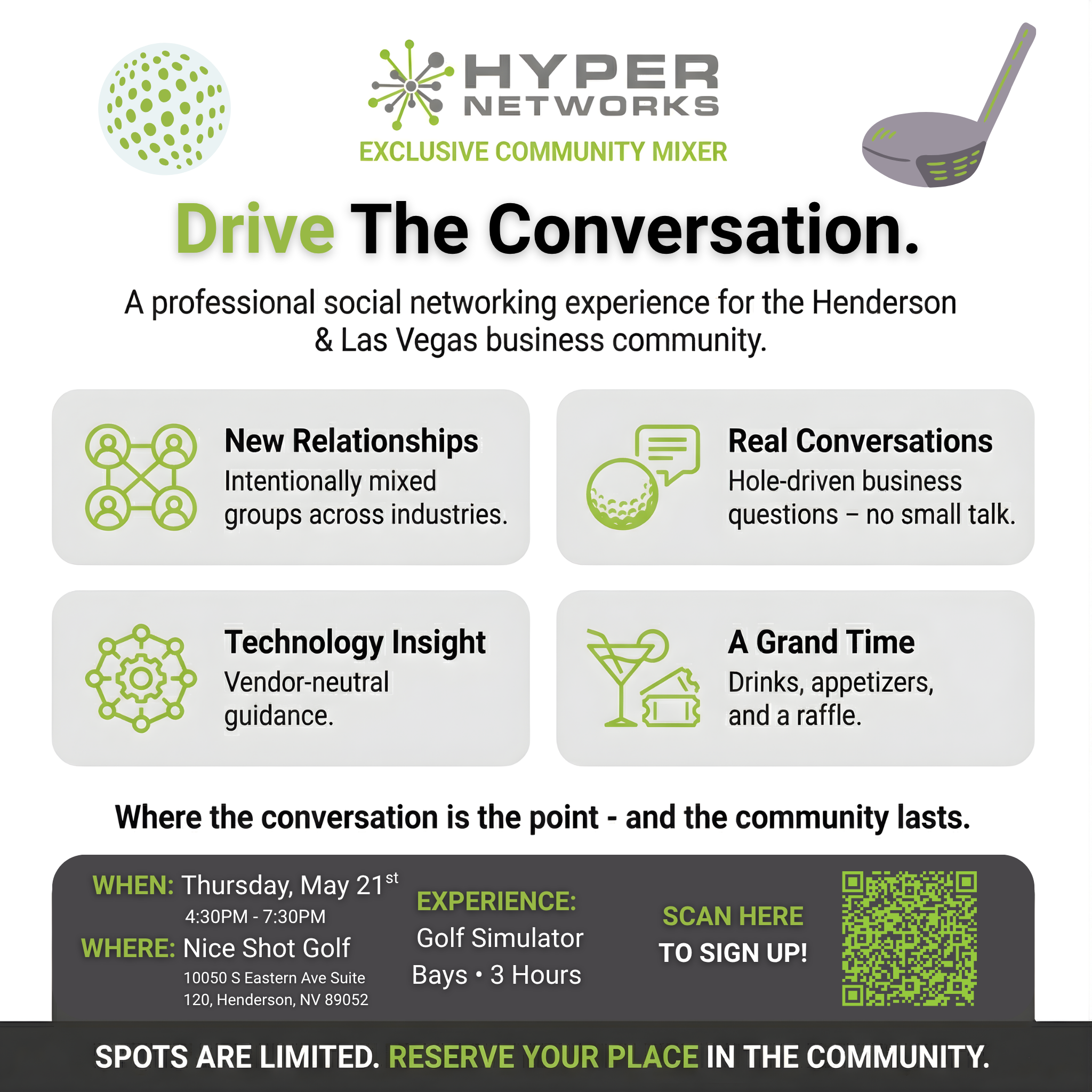 This is a free business networking mixer hosted at Nice Shot Golf. Guests are welcome to drop in and connect with local professionals in a relaxed setting. A raffle with prizes will be held during the event. No registration fee is required; attendees are encouraged to bring business cards. The event will take place on May 21st, 2026, from 4:30PM to 7:30PM at Nice Shot Golf, 10050 S Eastern Ave Suite 120, Henderson, NV 89052.