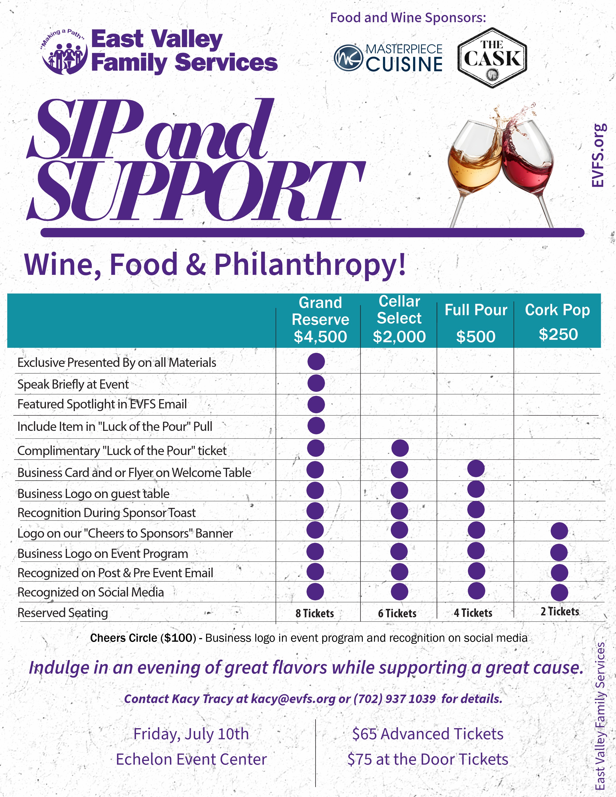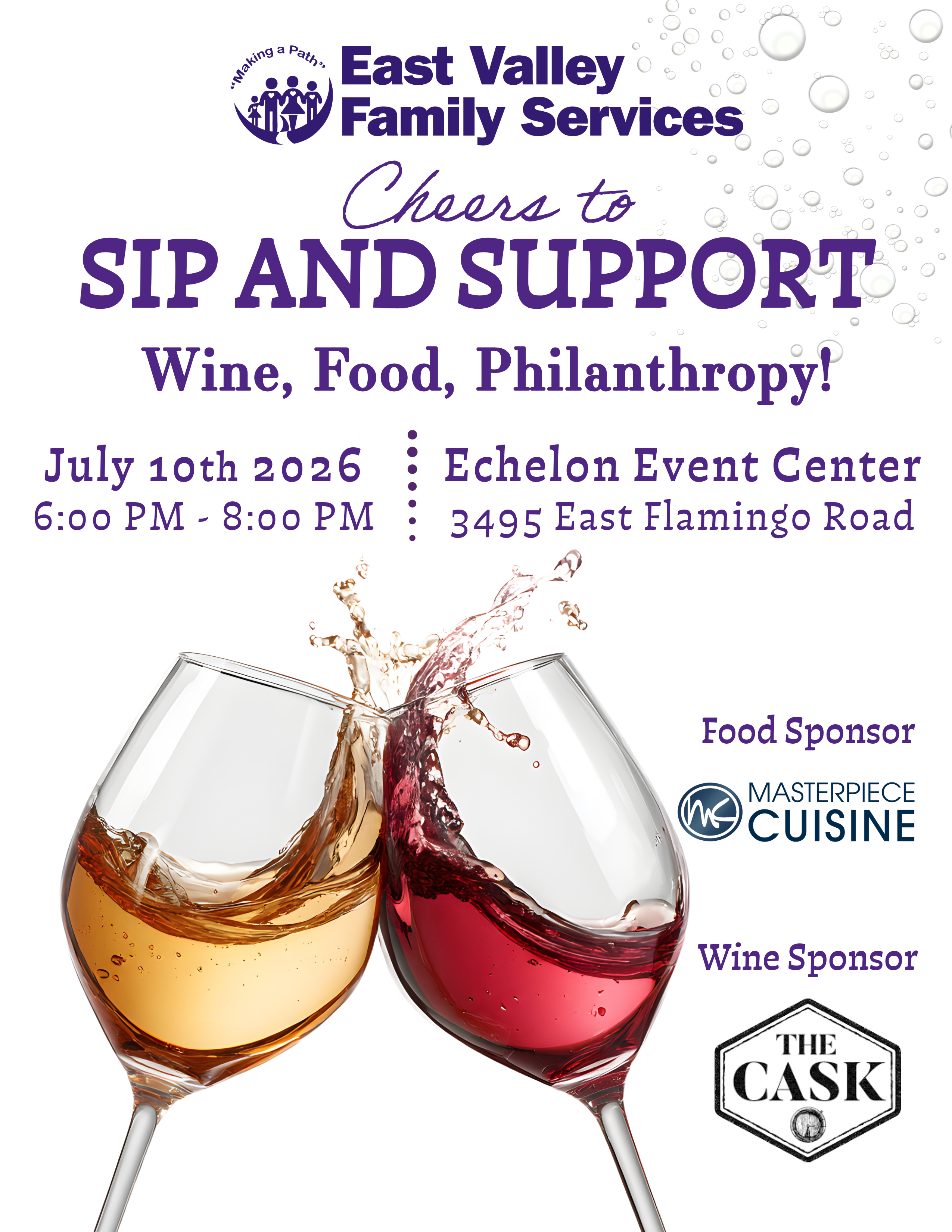 Join us for our annual Sip and Support — a wine tasting fundraiser happening on Friday, July 10th at the beautiful Echelon Event Center in Las Vegas. This fundraiser will bring an evening of exquisite wines by the Cask, delectable food pairings by Masterpiece Cuisine, live music by DJ Jalapeno, various raffles and games and the opportunity to support East Valley Family Services and our mission to fostering healthy, responsible and self-sufficient families in the community.