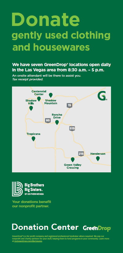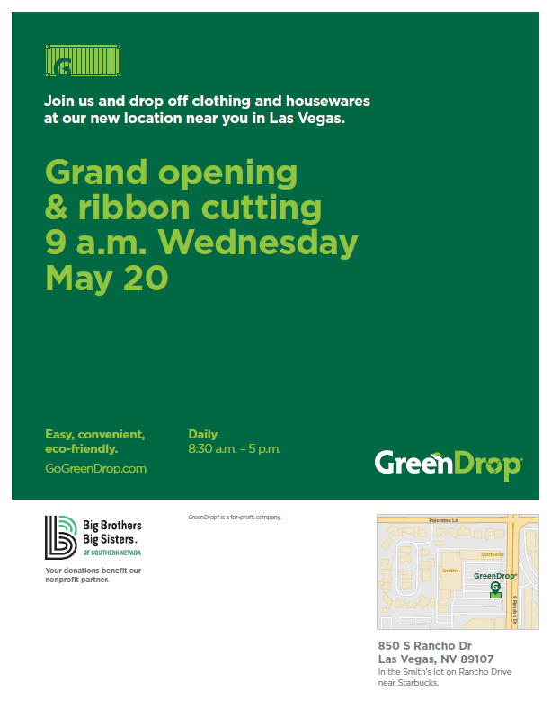 | 5/20/2026 | GreenDrop® donation centers offer the surrounding community a place to donate gently used clothing and household items they no longer need to Big Brothers Big Sisters of Southern Nevada. GreenDrop® is a for-profit company accepting these items on behalf of Big Brother Big Sisters, paying them for the goods, helping to fund their critical programs for youth in the community. Those items are then made available for purchase in secondhand thrift stores or wholesale markets, helping to keep reusable items out of landfills. GreenDrop is good for everyone! Open daily from 8:30 am to 5pm. PLEASE JOIN US FOR THESE TWO RIBBON CUTTING CELEBRATIONS! The more the merrier! Refreshments will be served! Please consider bringing a donation bag! more info... |