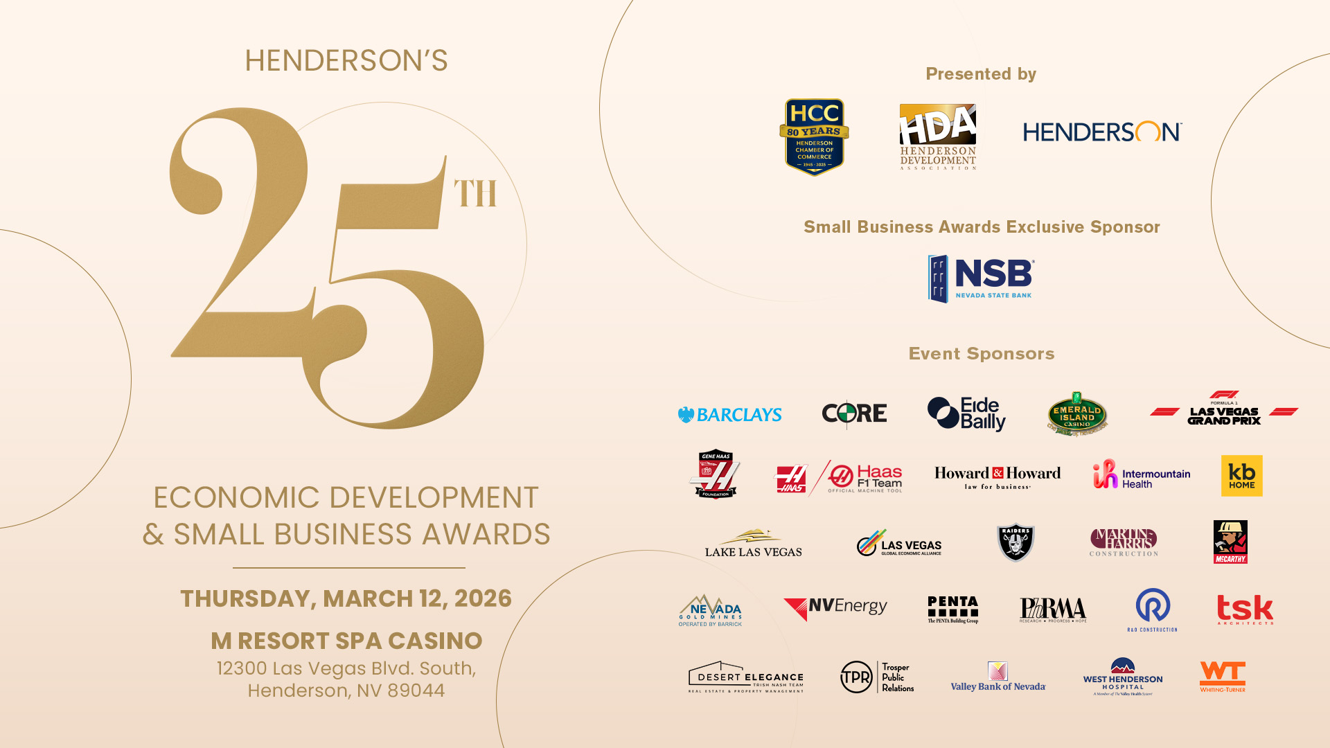 Presented by the Henderson Chamber of Commerce, Henderson Development Association, and City of Henderson, this signature event brings together civic and industry leaders to honor innovation, leadership, and lasting community impact. Join us as we recognize 25 years of progress and the people powering Henderson’s success.